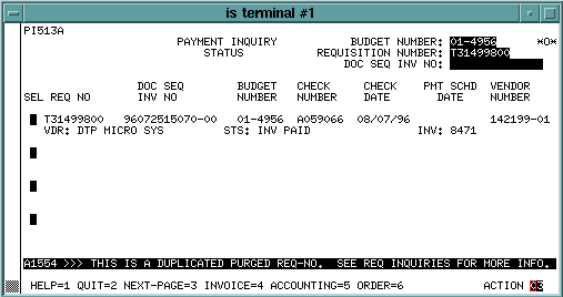 For detailed information on using the Order Screens, go to the appropriate section of this documentation. Payment Status ScreenOnce payment activity has occurred on a requisition, the requisition will have payment screens. When there is any payment activity, the General Data Screen will show a "YES" beside "PAYMENT."