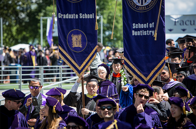 Each year the UW’s schools and colleges select students to lead their degree candidates into Husky Stadium during the Commencement procession. These students are called gonfalonieres, because they carry the school’s gonfalon, a banner that hangs down from a crosspiece and bears that school’s name and symbol. Following tradition borrowed from the Italian Renaissance, the gonfalonieres represent some of the UW’s most accomplished students.