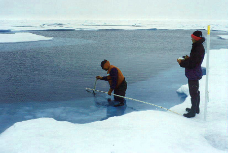 In this July 1998 photograph, researchers with the Surface Heat Budget of the Arctic Ocean project (SHEBA) collect data in a melted area of the Arctic Ocean ice pack.U.S. Army Cold Regions Research and Engineering Laboratory