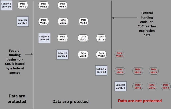 Data collected under an active CoC are permanently protected. This includes any data collected prior to obtaining the CoC because protections are retroactive. Protection continues even after study funding has ended and the study has been completed.