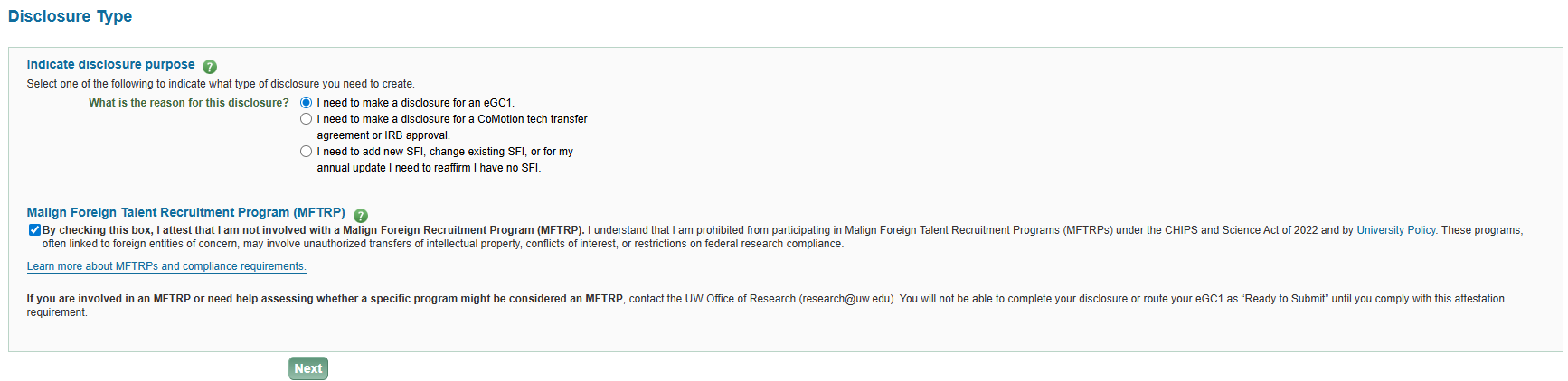 The second choice is for a CoMotion tech transfer agreement or IRB approval. The last choice is for adding or editing SFI or to reaffirm you have no SFI as part of an annual update.