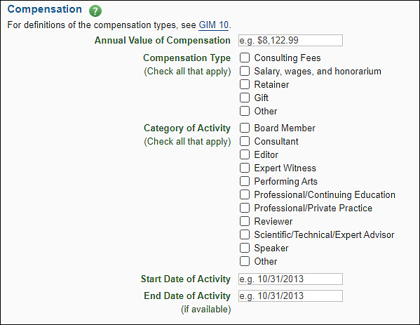 Investigators must disclose compensation from external sources. This section will display if you select “Compensation” in the Entity section. Use it to provide details on the amount and type of compensation you have received or are receiving from the named entity.