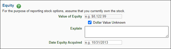 | Dollar Value Unknown | Check this if the value of the equity is unknown. If checked, an explanation field will display. You must include an explanation. |