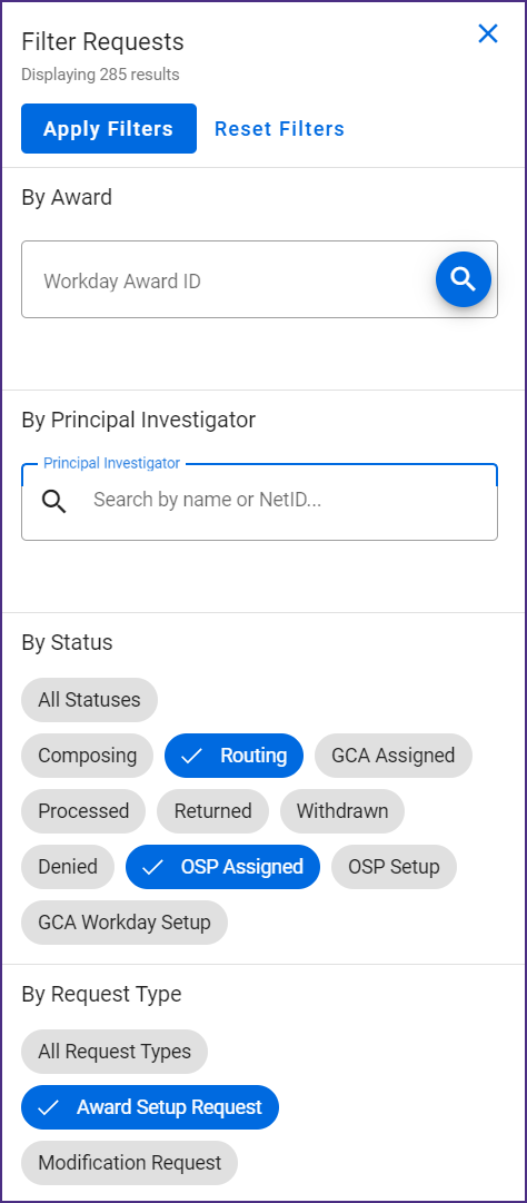 The following image shows the Routing and OSP Assigned status filters selected along with the Award Setup Request type. This filtered the tasklist to 285 results, as indicated just above the Apply Filters button.