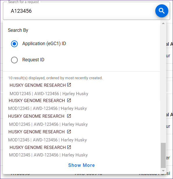 The results display below the Search By menu. The first line indicates the number of results found, up to ten items. If more than 10 items are returned, select the Show More button to display additional results. The search results are sorted by most recently created.