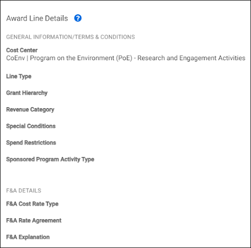 The Award Line Details section represents information that will integrate to Workday from SAGE Budget and the MOD. Some details like Terms and Conditions are entered by OSP and GCA, and will only be visible to campus once those units have taken their actions. This is a good opportunity to review the details that will comprise the award lines and grant details in Workday, prior to integration.