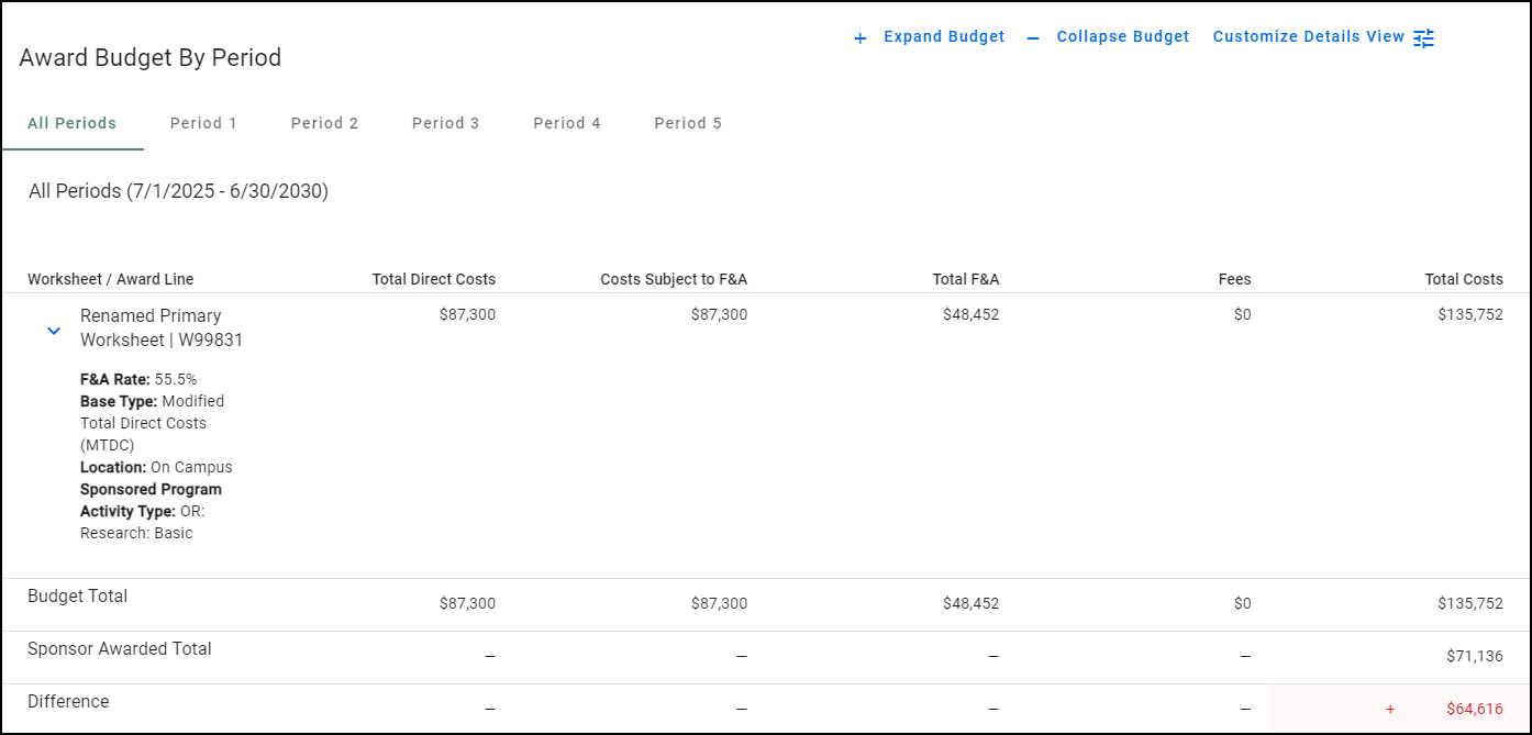 For a single Period, there is a Period Total row. For the All Periods view, there are Budget Total, Sponsor Awarded Total, and Difference rows.