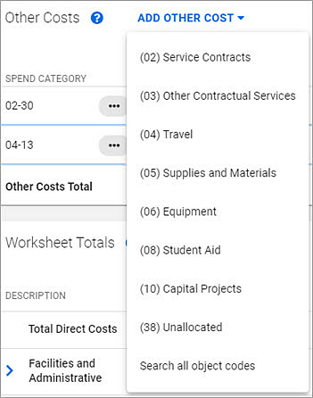 To add a cost to your worksheet, click on the Add Other Cost drop-down menu to the right of the section name. The choices in the menu are the object codes and descriptions, in ascending order, followed by “Search all object codes”. The following image shows the expanded menu.