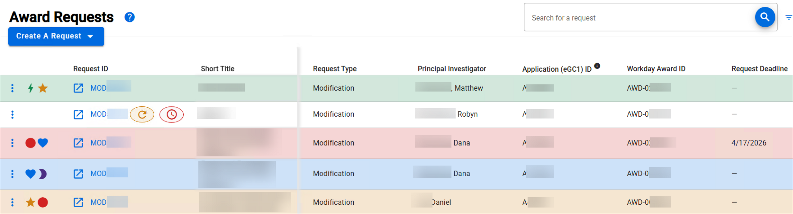 Note: The Request ID and Short Title columns are “frozen” so that they always display.