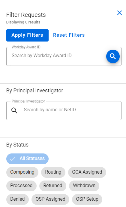 This displays the filtering options of By Award, By Principal Investigator, By Assignment, By Status, and By Request Type. You can select a combination of one or more values from the lists for your filter. A selected value will be highlighted in blue and have a checkmark.