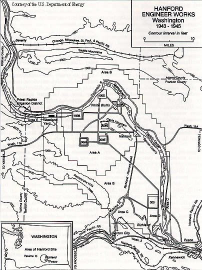 Map of the Hanford Engineer Works, 1943-1945 (left). (Reproduced in Grossman, "Hanford," PNQ 85:1, p.8. Courtesy of the U.S. Department of Energy.)